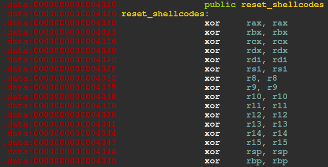 reset_shellcodes points to a sequence of opcodes stored in the .data section, the main function maps a 0x1000 bytes (page size - 4096 in decimal) using mmap(), copies the predefined opcodes from reset_shellcodes into that page using strcpy(),